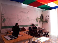 Revenant sur nos pas, nous avons partagé des taxis pour nous rendre chez Jokkolabs dans une autre partie de la ville. Ces déplacements ont été l’occasion de former, déformer et reformer notre groupe au contact des autres participants ; pour la plupart, des collègues chercheurs participant à la même conférence, mais aussi un couple de Français curieux en vacances à Dakar ! L’occasion de se présenter, de partager nos étonnements, de poser des questions, de parler de nos travaux respectifs, de comparer avec d’autres espaces et pratiques ailleurs dans le monde…